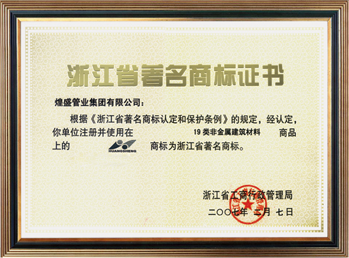 當前位置:集團首頁 - 關于煌盛 - 浙江省著名商標證書